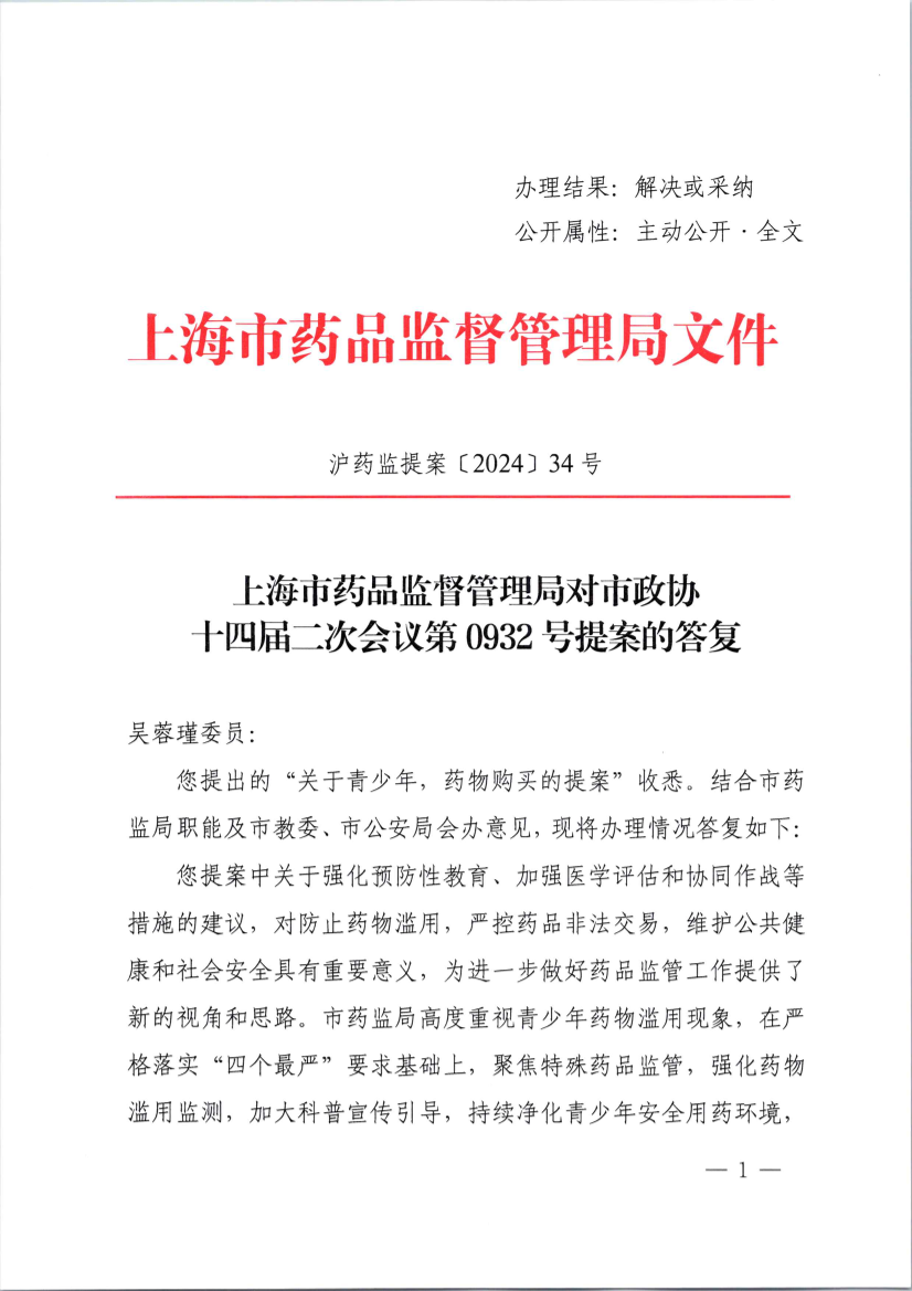 您提出的“关于青少年,药物购买的提案”收悉。结合918博天堂职能及市教委、市公安局会办意见,现将办理情况答复如下:
