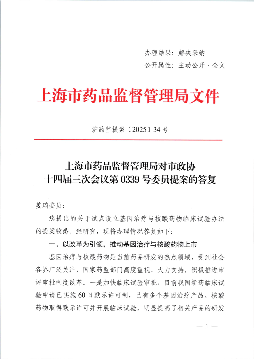 您提出的关于试点设立基因治疗与核酸药物临床试验办法的提案收悉。经研究,现将办理情况答复如下: