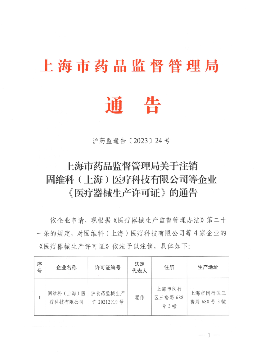 依企业申请,现根据《医疗器械生产监督管理办法》第二十一条的规定,对固维科(上海)医疗科技有限公司等4家企业的《医疗器械生产许可证》依法予以注销,具体如下: