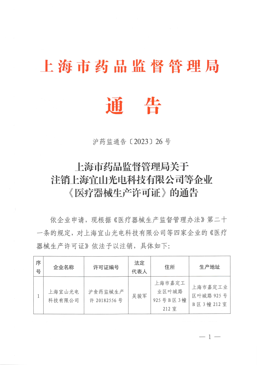 依企业申请,现根据《医疗器械生产监督管理办法》第二十一条的规定,对上海宜山光电科技有限公司等四家企业的《医疗器械生产许可证》依法予以注销,具体如下: