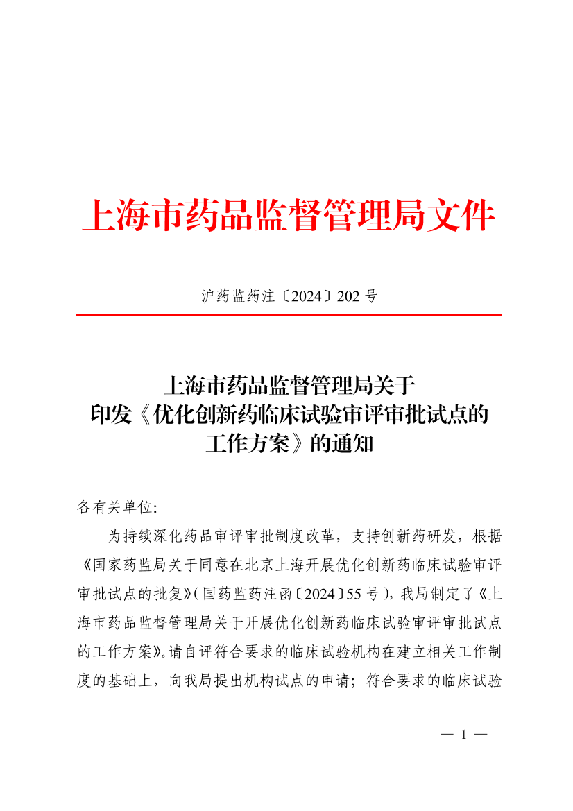 为深入学习贯彻席大大总书记考察上海重要讲话精神,进一步贯彻落实中共中央、国务院关于支持上海建设“五个中心”的意见,对标国际规则规范实施临床试验项目、缩短临床试验启动整体用时等多项改革任务,根据《918博天堂关于同意在北京上海开展优化创新药临床试验审评审批试点的批复》(国药监药注函〔2024〕55号),本市已获批同意开展优化创新药临床试验审评审批试点。为做好相关试点工作,制订本方案。