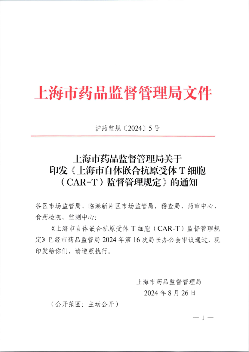 《上海市自体嵌合抗原受体T细胞(CAR-T)监督管理规定》已经市药品监管局2024年第16次局长办公会审议通过,现印发给你们,请遵照执行。