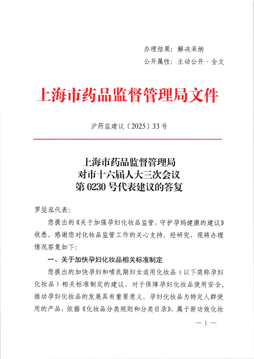 您提出的加快孕妇和哺乳期妇女适用化妆品(以下简称孕妇化妆品)相关标准制定的建议,对于保障孕妇化妆品使用安全,推动孕妇化妆品的发展具有重要意义。孕妇化妆品为特定人群使用的产品,依据《化妆品分类规则和分类目录》,属于新功效化妆品。标准是创新发展的引领和推动力量,我局联合市市场监管局,紧密跟踪市场需求和行业发展趋势,积极支持行业协会等相关社会团体围绕孕妇化妆品研究制定高质量团体标准,支持行业协会、科研院校、检测机构、头部企业等开展孕妇化妆品检测方法的研究和应用,引导行业规范发展。自《化妆品监督管理条例》实施以来,我局已指导上海日用化学品行业协会制定了化妆品生产质量管理、产品功效测试、原料和包装材料质量和安全评估等方面的40余项团体标准,下一步,将结合行业需求,继续指导协会推进相关标准在孕妇化妆品研发中的应用。