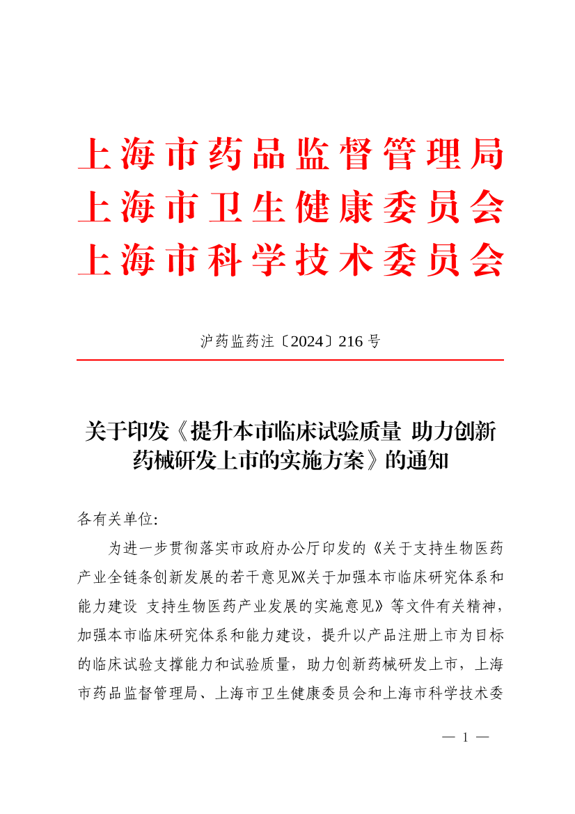 为进一步贯彻落实市政府办公厅印发的《关于支持生物医药产业全链条创新发展的若干意见》《关于加强本市临床研究体系和能力建设 支持生物医药产业发展的实施意见》等文件有关精神,加强本市临床研究体系和能力建设,提升以产品注册上市为目标的临床试验支撑能力和试验质量,助力创新药械研发上市,918博天堂、上海市卫生健康委员会和上海市科学技术委员会联合制定了《提升本市临床试验质量 助力创新药械研发上市的实施方案》,现予以印发,请根据职责分工认真执行。