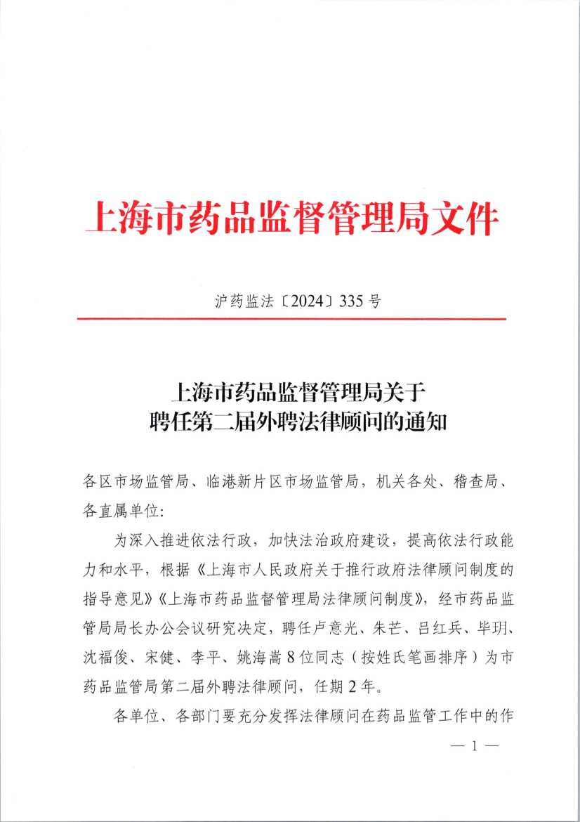 为深入推进依法行政,加快法治政府建设,提高依法行政能力和水平,根据《上海市人民政府关于推行政府法律顾问制度的指导意见》《918博天堂法律顾问制度》,经市药品监管局局长办公会议研究决定,聘任卢意光、朱芒、吕红兵、毕玥、沈福俊、宋健、李平、姚海嵩8位同志(按姓氏笔画排序)为市药品监管局第二届外聘法律顾问,任期2年。