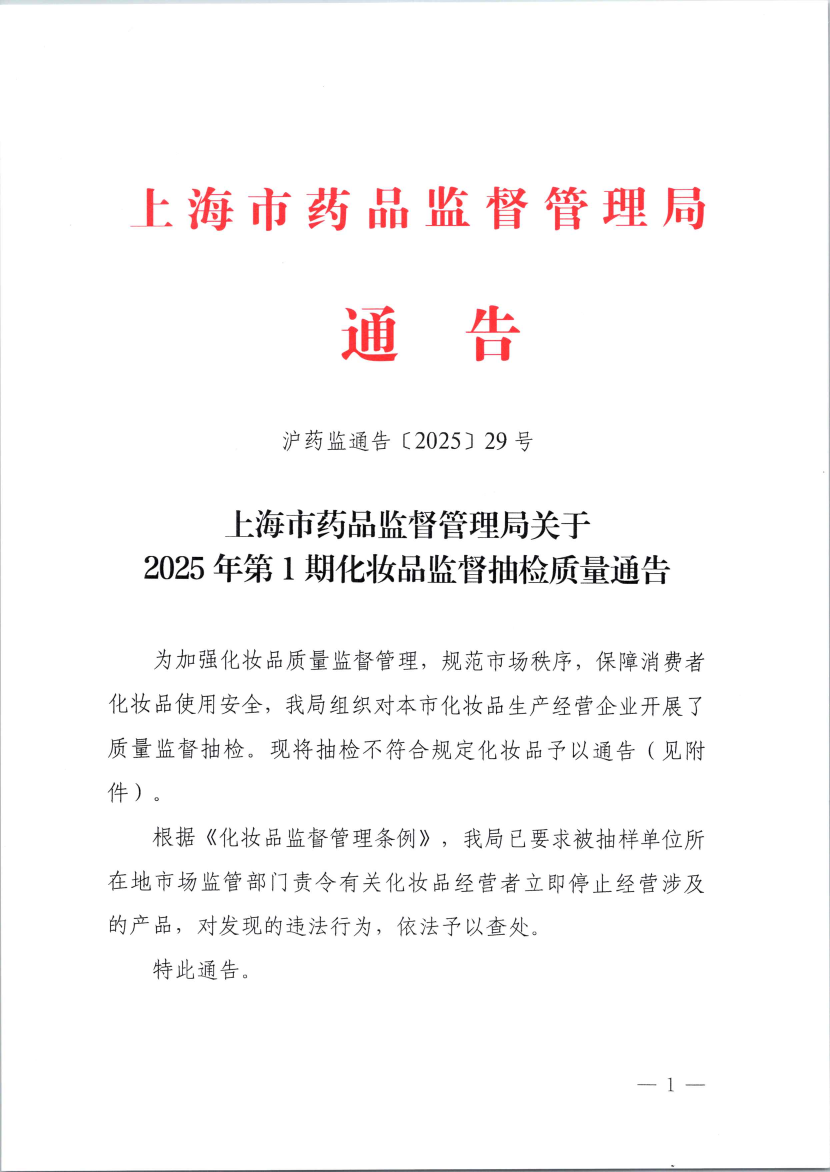 918博天堂关于2025年第1期化妆品监督抽检质量通告